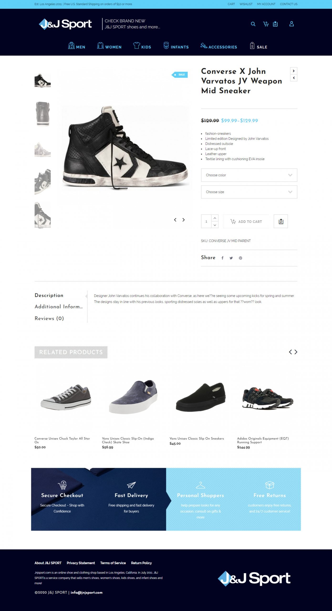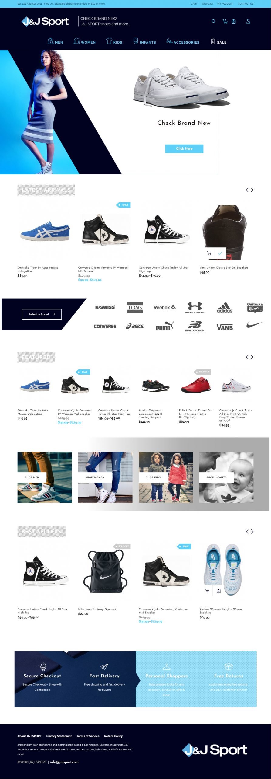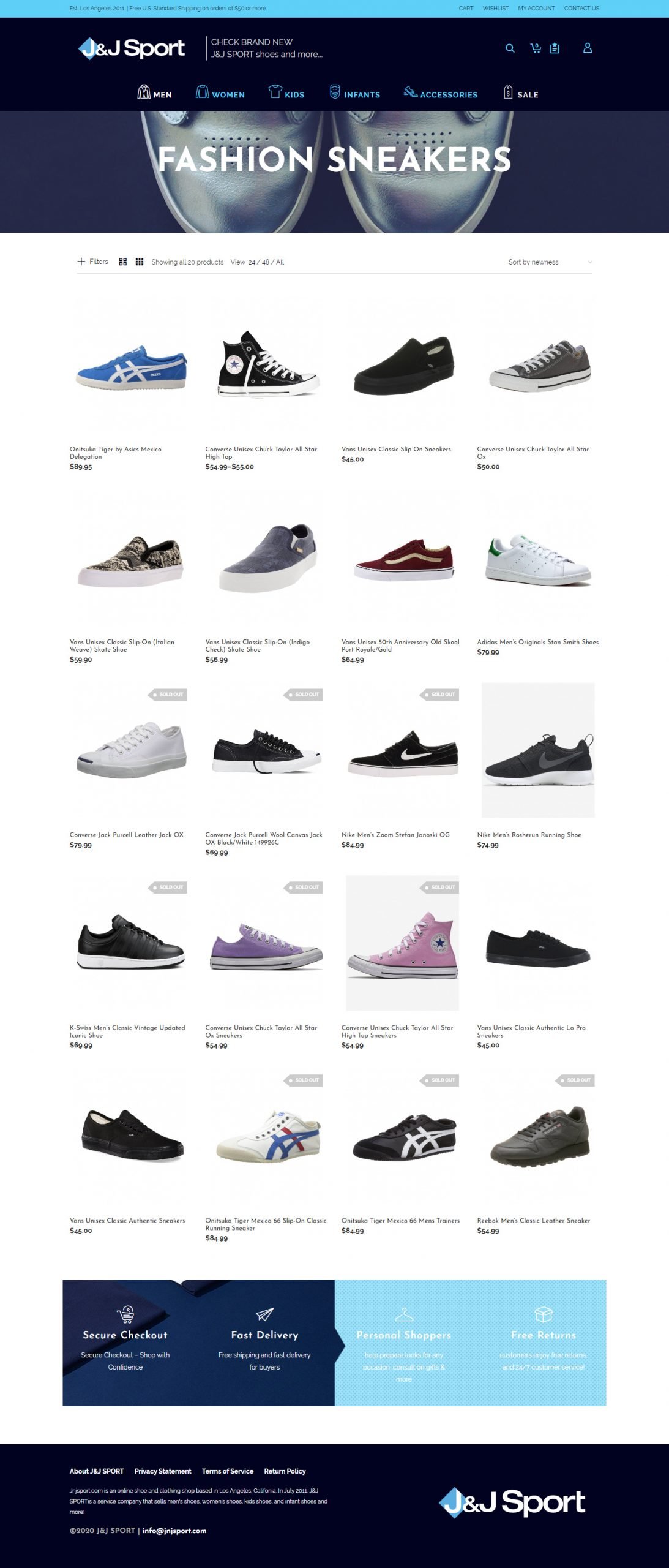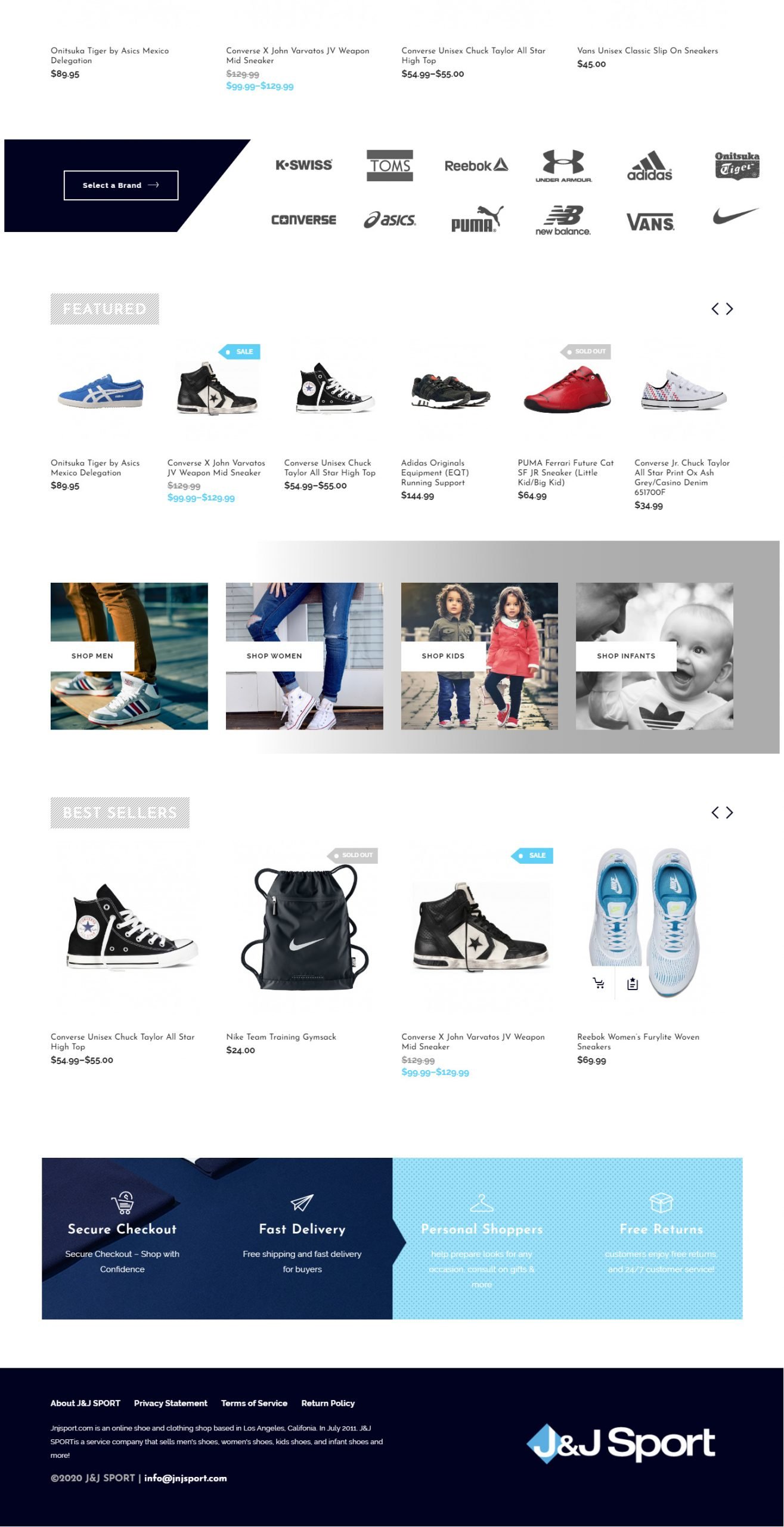 슈즈 및 의류를 주로 판매하는 J&J Sport의 이커머스 사이트이며 슈즈의 다양한 칼라와 사이즈 배리에이션이 적용될 수 있도록 우커머스를 이용하여 제작