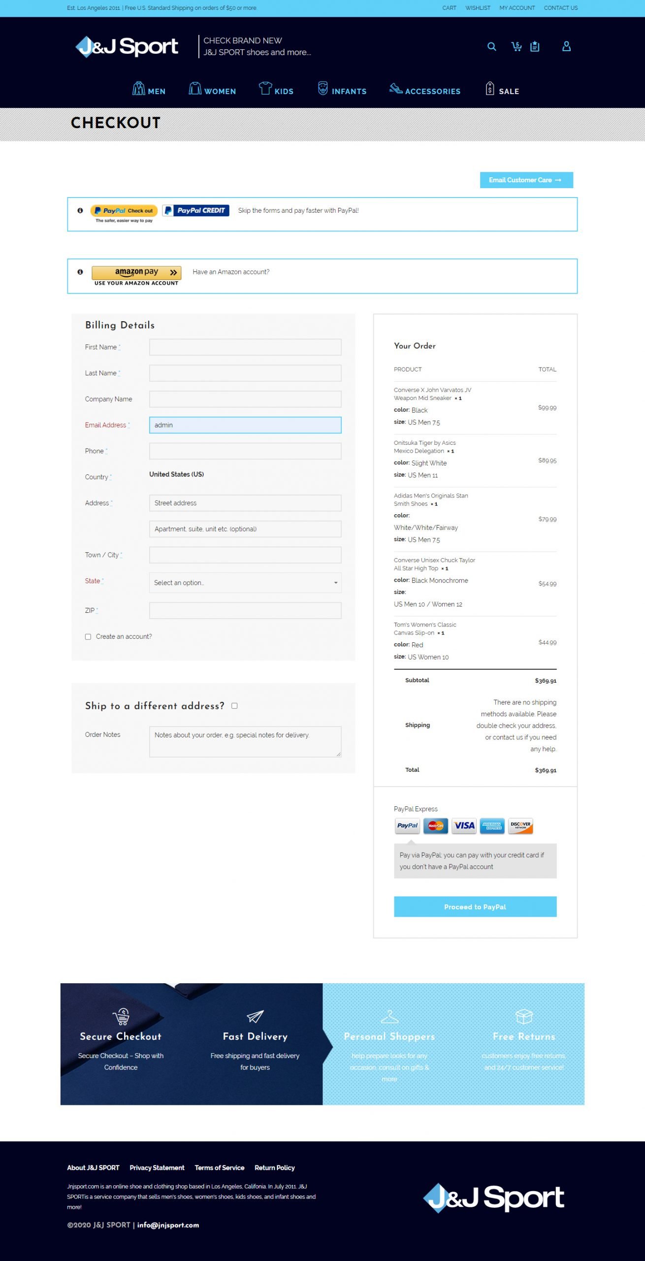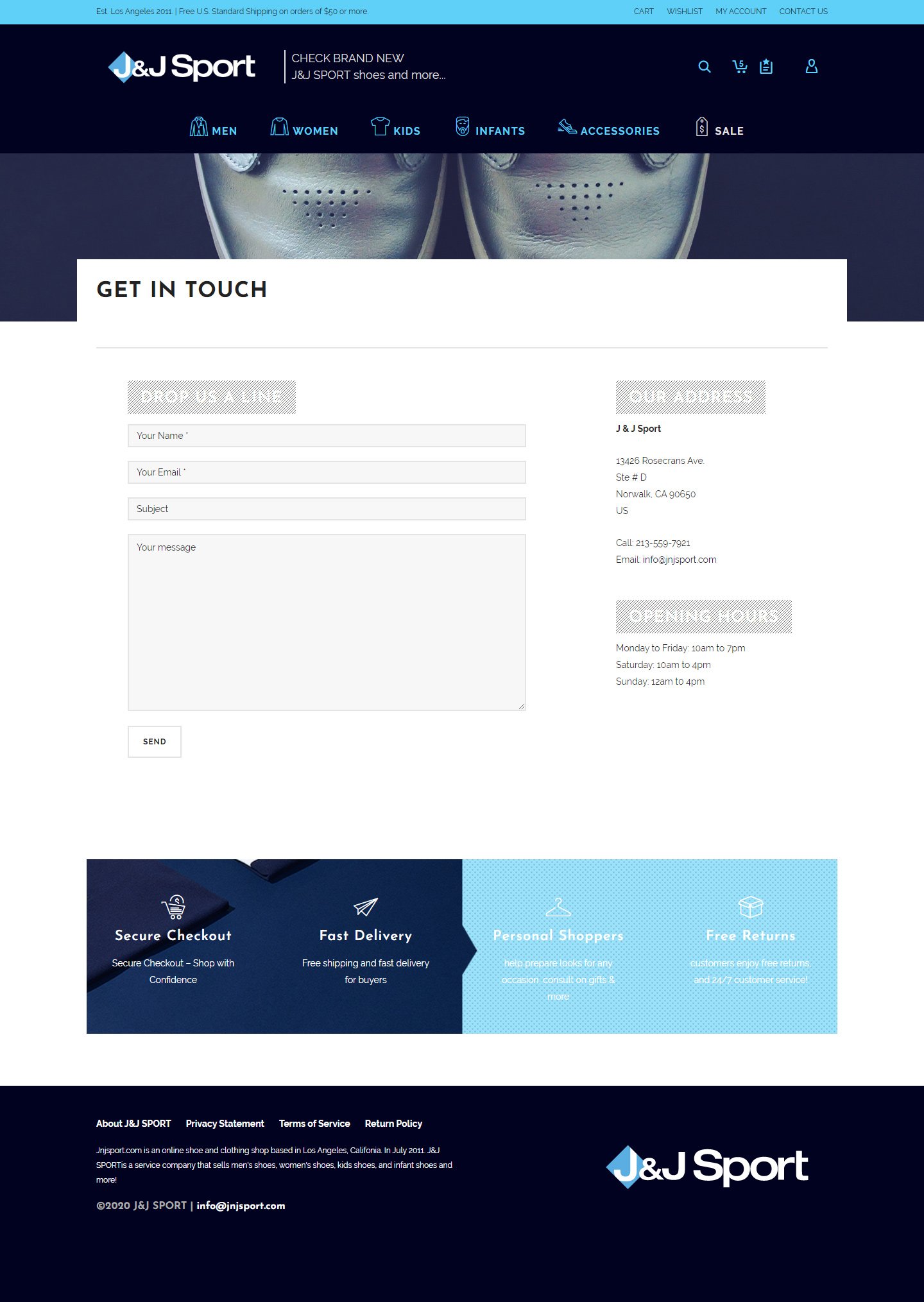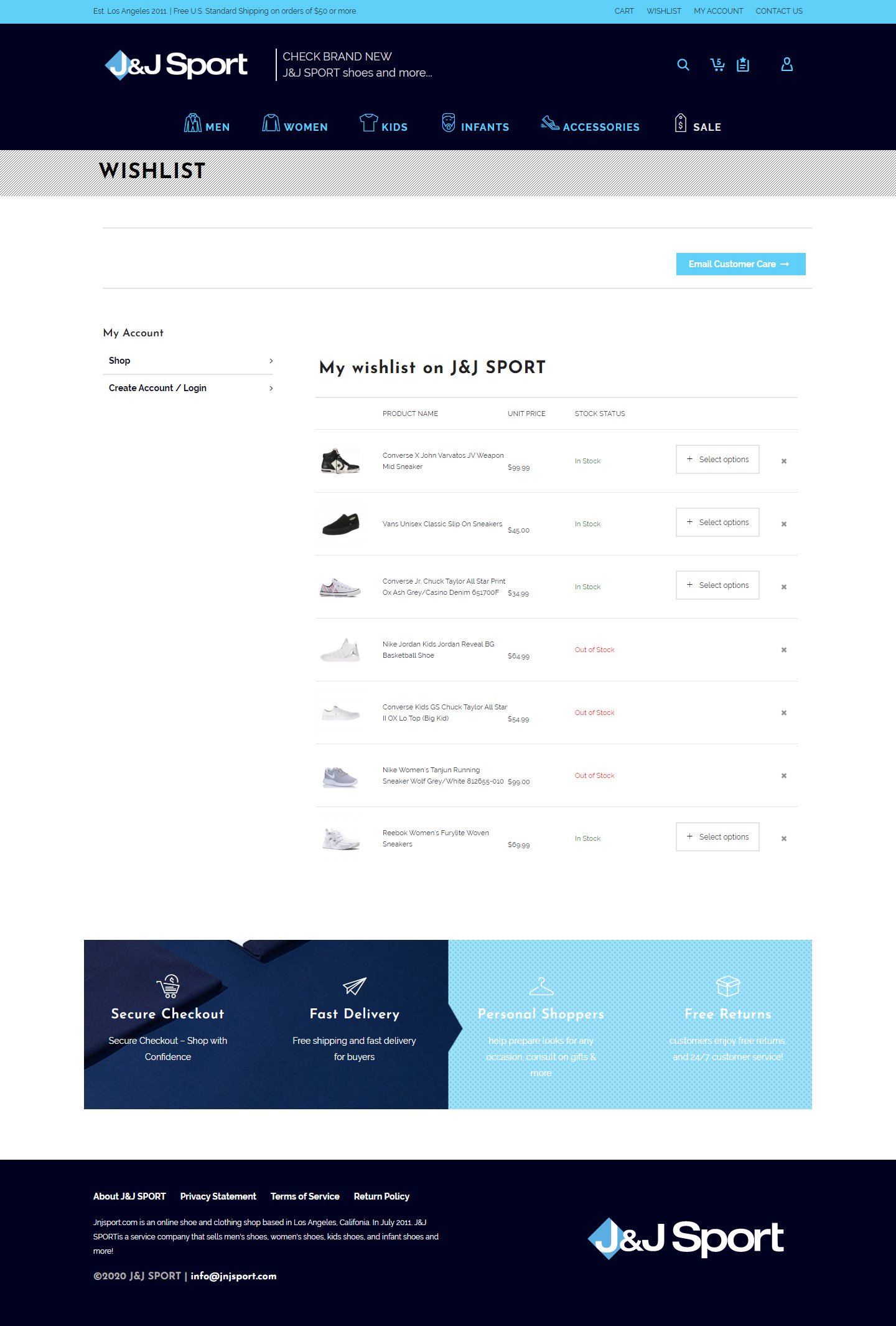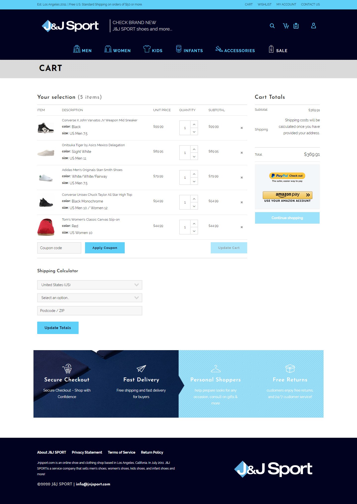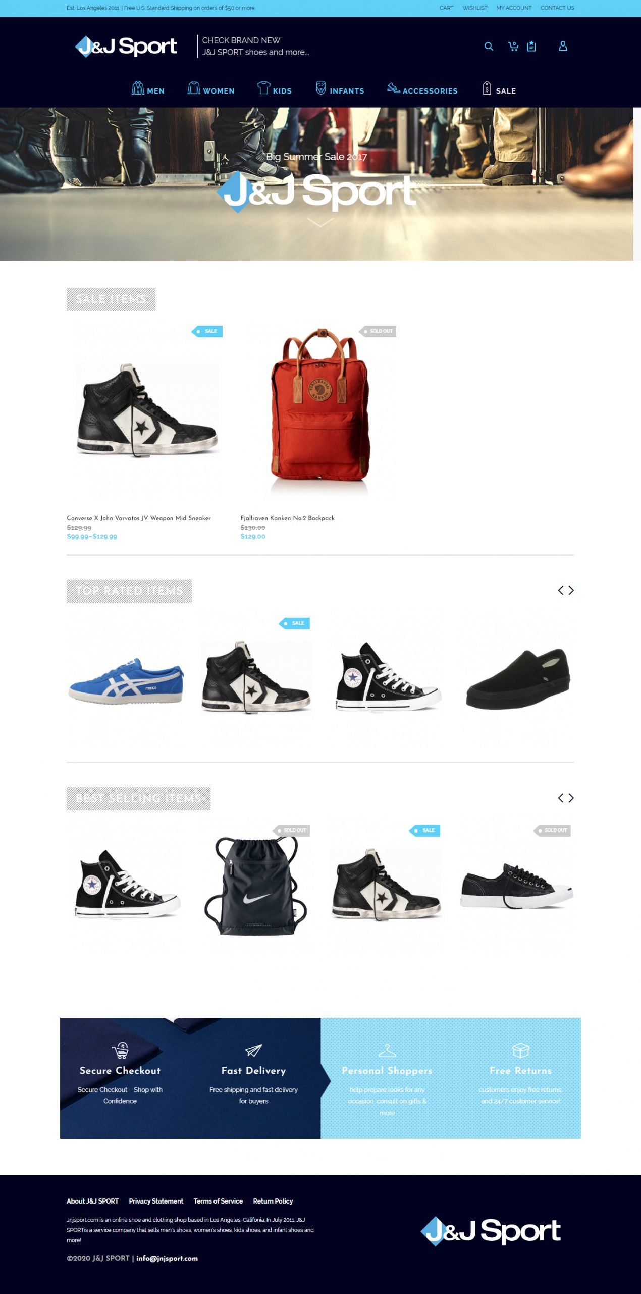 슈즈 및 의류를 주로 판매하는 J&J Sport의 이커머스 사이트이며 슈즈의 다양한 칼라와 사이즈 배리에이션이 적용될 수 있도록 우커머스를 이용하여 제작